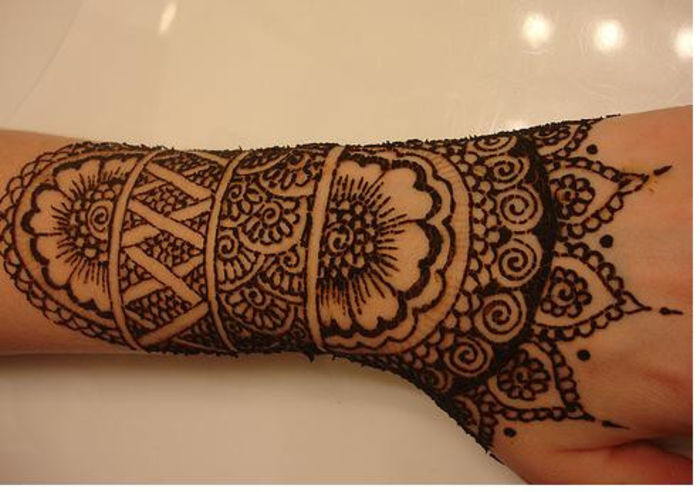 Mehndi este aplicarea Henna temporara ca decor al pielii. a devenit la moda in Occident la sfarsitul anilor '90. Henna este de obicei aplicat in timpul ocaziilor speciale, cum ar fi nunti si festivaluri. De obicei, este desenat pe palme si picioare. Henna a fost initial folosita ca o forma de decor in principal pentru mirese. Pasta de Henna este de obicei aplicata pe piele folosind un con de plastic sau o perie, dar uneori este folosit un metal mic cu varf de sticla. Dupa ce Henna este aplicata zona pictata se acopera pentru a intra mai bine in piele. Aceste bandaje sunt tinute pe zona pictata pe timpul noptii iar dimineata sunt date jos. Aceste picturi au o durabilitate cuprinsa intre 2 saptamani si mai multe luni in functie de tipul de pasta folosit si au o culoare maro - roscat. Modele complicate de Mehndi sunt, de obicei aplicate pentru mirese inainte de ceremoniile de nunta. Aceasta ceremonie a picturii cu henna este sarbatorita de obicei de familia miresei. Acest ritual se face in ajunul ceremoniei de casatorie sau cu cateva zile inainte de aceasta. La acest ritual participa si mirele dar sunt invitate si fete care sa danseze imbracate in culori vii cum ar fi rozul si galbenul. La sfarsitul pictatului mainilor/picioarelor mireasa danseaza in mijlocul fetelor imbracata in costumul traditional care a tenta de violet.